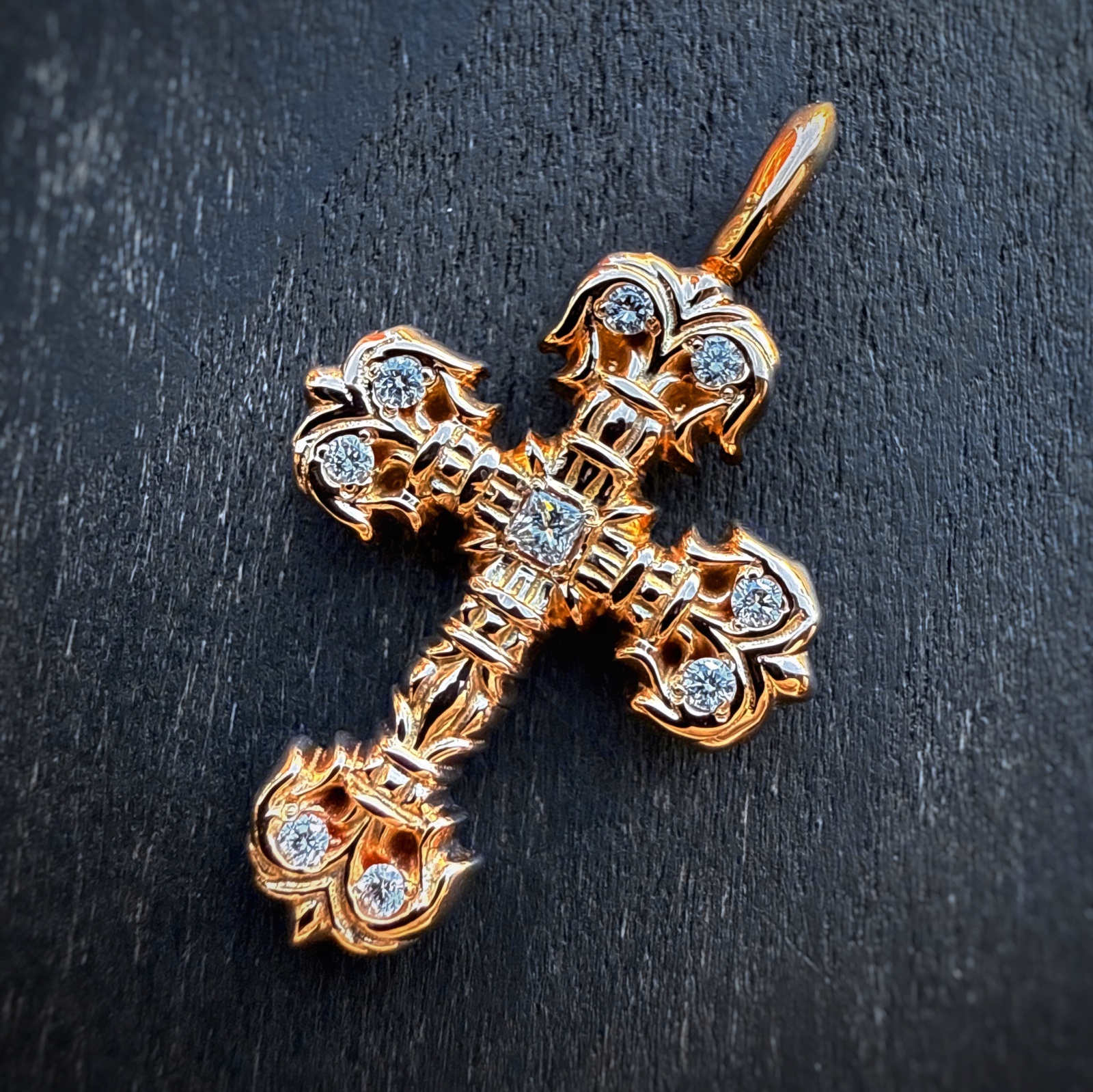 クロムハーツの中でも最高峰の輝きを放つ「22Kゴールド」。その中でも緻密な造形美で知られる「フィリグリー クロス ミニ」を、純正仕様のパヴェダイヤモンドへカスタムいたしました!